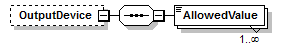 | source | <xs:element name="OutputDevice" minOccurs="0"> <xs:complexType> <xs:sequence> <xs:element name="AllowedValue" type="xs:string" maxOccurs="unbounded"/> </xs:sequence> </xs:complexType> </xs:element> |