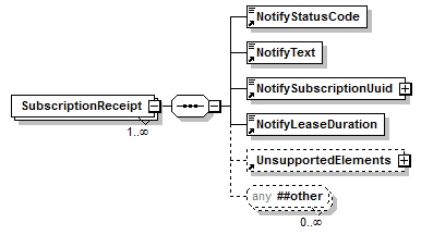 | source | <xs:element name="SubscriptionReceipts" minOccurs="0"> <xs:complexType> <xs:sequence> <xs:element name="SubscriptionReceipt" maxOccurs="unbounded"> <xs:complexType> <xs:sequence> <xs:element ref="NotifyStatusCode"/> <xs:element ref="NotifyText"/> <xs:element ref="NotifySubscriptionUuid"/> <xs:element ref="NotifyLeaseDuration"/> <xs:element ref="UnsupportedElements" minOccurs="0"/> <xs:any namespace="##other" minOccurs="0" maxOccurs="unbounded"/> </xs:sequence> </xs:complexType> </xs:element> </xs:sequence> </xs:complexType> </xs:element> |