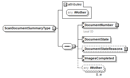 | source | <xs:complexType name="ScanDocumentSummaryType"> <xs:sequence> <xs:element ref="DocumentNumber"/> <xs:element ref="DocumentState"/> <xs:element ref="DocumentStateReasons" minOccurs="0"/> <xs:element ref="ImagesCompleted"/> <xs:any namespace="##other" minOccurs="0" maxOccurs="unbounded"/> </xs:sequence> <xs:anyAttribute namespace="##other" processContents="lax"/> </xs:complexType> |