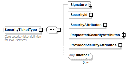 | source | <xs:complexType name="SecurityTicketType"> <xs:annotation> <xs:documentation>Core security ticket defintion for PWG services </xs:documentation> </xs:annotation> <xs:sequence> <xs:element name="Signature" type="ds:SignatureType" minOccurs="1" maxOccurs="1"/> <xs:element name="SecurityId" type="SecurityIdentificationType"/> <xs:element name="SecurityAttributes" type="SecurityAttributesType"/> <xs:element name="RequestedSecurityAttributes" type="SecurityAttributesType"/> <xs:element name="ProvidedSecurityAttributes" type="SecurityAttributesType"/> <xs:any namespace="##other" processContents="lax" minOccurs="0" maxOccurs="unbounded"/> </xs:sequence> </xs:complexType> |