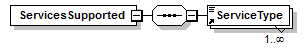 | source | <xs:element name="ServicesSupported"> <xs:complexType> <xs:sequence> <xs:element ref="ServiceType" maxOccurs="unbounded"/> </xs:sequence> </xs:complexType> </xs:element> |