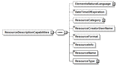 | source | <xs:element name="ResourceDescriptionCapabilities" minOccurs="0"> <xs:complexType> <xs:sequence> <xs:element name="ElementsNaturalLanguage" minOccurs="0"> <xs:complexType> <xs:sequence> <xs:element name="AllowedValue" type="NaturalLanguageType" maxOccurs="unbounded"/> </xs:sequence> </xs:complexType> </xs:element> <xs:element name="DateTimeOfExpiration" type="xs:boolean" minOccurs="0"/> <xs:element name="ResourceCategory" minOccurs="0"> <xs:complexType> <xs:sequence> <xs:element name="AllowedValue" maxOccurs="unbounded"> <xs:simpleType> <xs:union memberTypes="ResourceCategoryWKV KeywordNsExtensionPattern"/> </xs:simpleType> </xs:element> </xs:sequence> </xs:complexType> </xs:element> <xs:element name="ResourceCreatorUserName" type="xs:boolean" minOccurs="0"/> <xs:element name="ResourceFormat" type="xs:boolean" minOccurs="0"/> <xs:element name="ResourceInfo" type="xs:boolean" minOccurs="0"/> <xs:element name="ResourceName" type="xs:boolean"/> <xs:element name="ResourceType"> <xs:complexType> <xs:sequence> <xs:element name="AllowedValue" type="ResourceTypeType" maxOccurs="unbounded"/> </xs:sequence> </xs:complexType> </xs:element> </xs:sequence> </xs:complexType> </xs:element> |