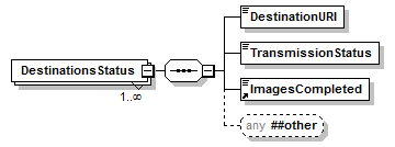 | source | <xs:element name="DestinationsStatuses" minOccurs="0"> <xs:complexType> <xs:sequence> <xs:element name="DestinationsStatus" maxOccurs="unbounded"> <xs:complexType> <xs:sequence> <xs:element name="DestinationURI" type="xs:anyURI"/> <xs:element name="TransmissionStatus" type="TransmissionStatusWKV"/> <xs:element ref="ImagesCompleted"/> <xs:any namespace="##other" minOccurs="0"/> </xs:sequence> </xs:complexType> </xs:element> </xs:sequence> </xs:complexType> </xs:element> |