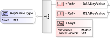 <?xml version="1.0" encoding="utf-16"?> <complexType name="KeyValueType" mixed="true"> <choice> <element ref="ds:DSAKeyValue" /> <element ref="ds:RSAKeyValue" /> <any namespace="##other" processContents="lax" /> </choice> </complexType>